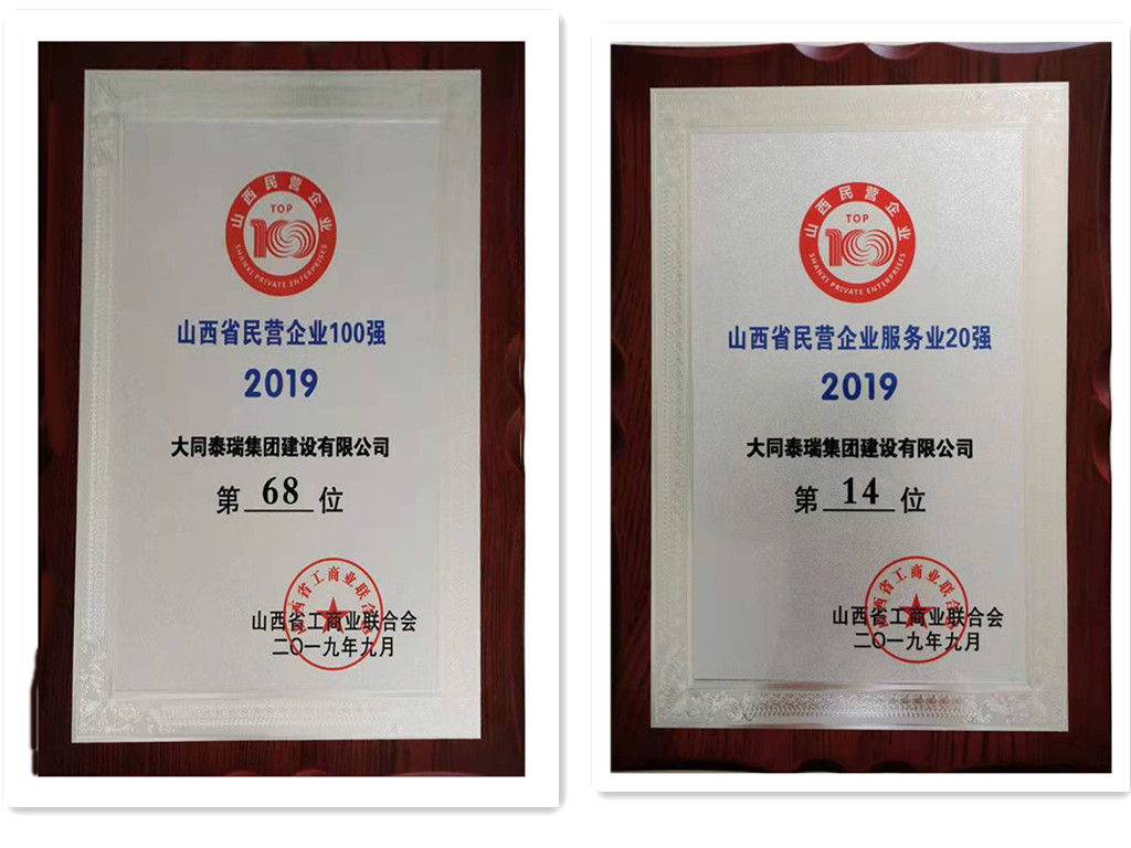 泰瑞集团荣登“2019山西民营企业100强”和“2019山西民营企业服务业20强”榜单