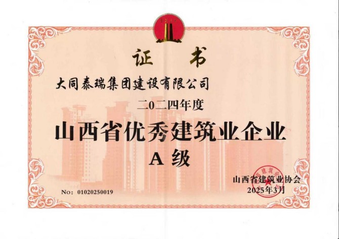 图为:2025年获评2024年度山西省优秀建筑业企业A级