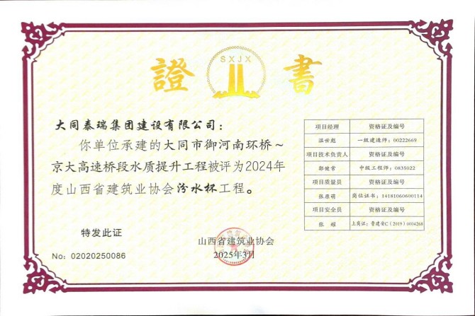 图为:本单位承建的大同市御河南环-京大高速桥段水质提升工程获2024年度山西省建筑业协会汾水杯工程